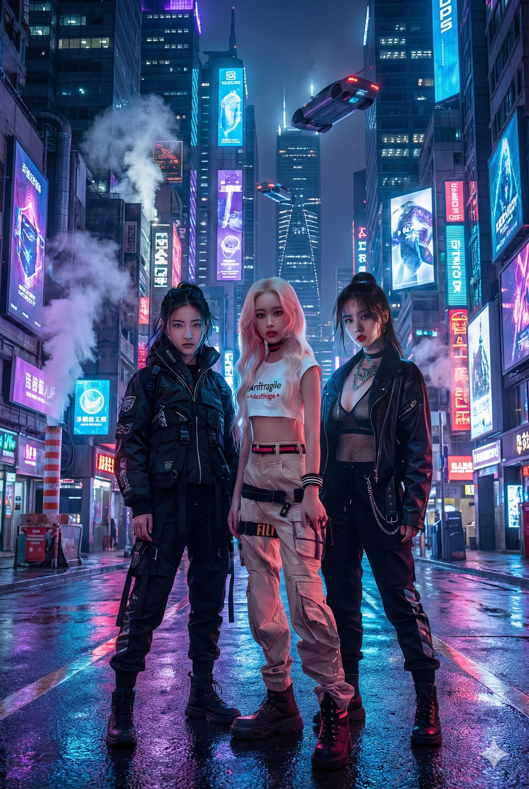- Cyberpunk & Girl Crush: Techwear, neon city background, straps and buckles, tactical gear, chromatic aberration, led mask, rainy street at night.